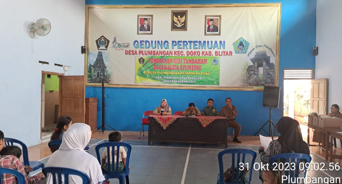 Balance News | Blitar – Babinsa Koramil 0808/13 Doko Kodim 0808/Blitar Sertu Supriendi, melaksanakan kegiatan pendampingan pembagian gizi tambahan kepada 25 balita stunting. Bertempat di Aula Kantor Desa Plumbangan Kec. Doko Kab. Blitar, Selasa (31/10/2023).