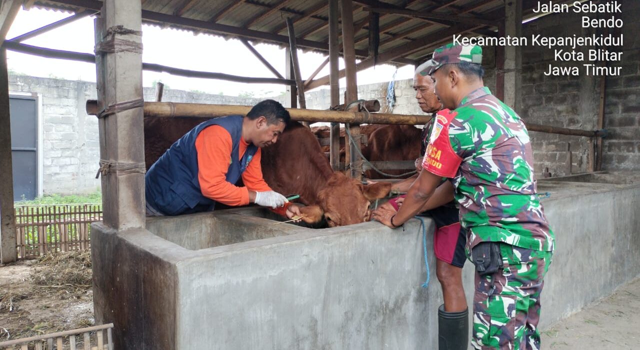 Menindak lanjuti hal ini, Dinas Ketahanan Pangan dan Peternakan Kota Blitar, di dampingi Babinsa Koramil 0808/01 Sukorejo. Kodim 0808/Blitar Serma Hajib, melaksanakan kegiatan vaksinasi PMK dan pemberian vitamin terhadap hewan ternak sapi yang ada di wilayah binaannya. Bertempat di Kelurahan Bendo Kec. Kepanjenkidul Kota Blitar, Selasa (9/5/2023).