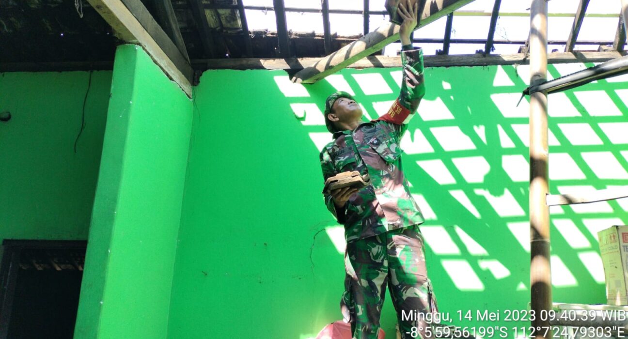 Balance News | Blitar – Dengan penuh semangat, Babinsa Koramil 0808/06 Srengat Kodim 0808/Blitar Sertu Puji Suharto bersama warga masyarakat, melaksanakan kegiatan kerja bakti dan gotong royong bersama, untuk membantu memperbaiki rumah warga binaannya atas nama Bapak M. Tohir, bertempat di Dsn. Wates RT. 04 RW. 02 Desa Purwokerto Kec. Srengat Kab. Blitar, Minggu (14/5/2023).