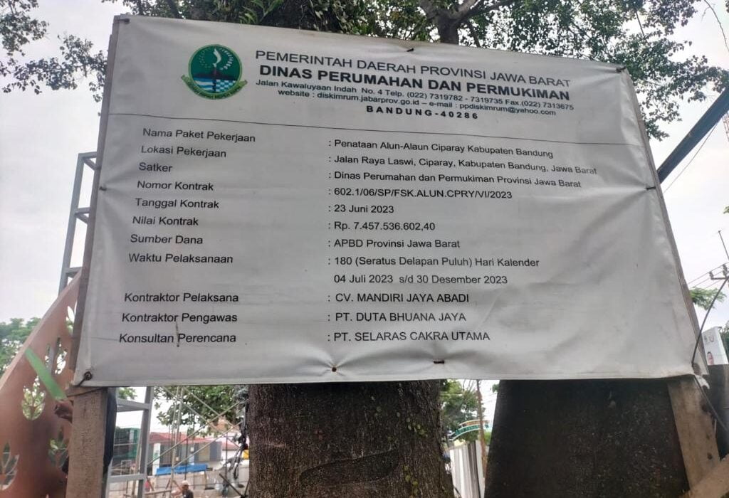 Penataan Alun-Alun Ciparay di Jalan Raya Laswi, Kecamatan Ciparay, Kabupaten Bandung yang menggunakan anggaran APBD Provinsi Jawa Barat, sebesar Rp.7.457.536.602.40,- dengan Nomor kontrak: 602.1/06/SP/FSK.Alun.Ciparay/Vl/2023, dengan Tanggal Kontrak. (23 Juni 2023).
