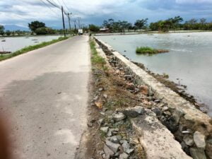 Tambahnya “bahkan Spek pengerjaannya juga terlihat tidak di gali terlebih dahulu, sehingga proses penempatan batu kali sebagai pondasi awal langsung di tancap-tancapkan ke lumpur yang berair”.