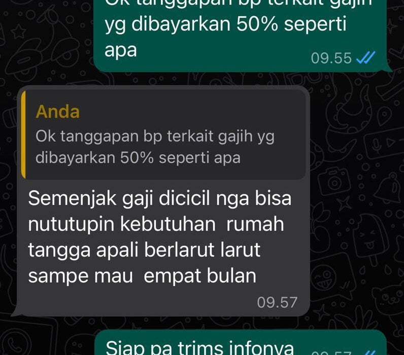 Pasalnya hak karyawan belum di penuhi, karyawan dalam hal ini masih koperatif bekerja sesuai dengan ketentuan jam kerja yang berlaku namun di karenakan sejak bulan September dan karyawan menerima gaji secara di cicil dan kebutuhan rumah tangga tidak dapat terpenuhi, suasana kerjapun sudah mulai tidak kondusif.