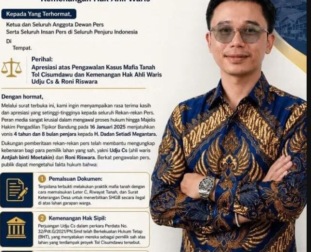 BALANCE NEWS || SUMEDANG – Dugaan skandal pencairan dana konsinyasi ganti rugi lahan proyek Tol Cisumdawu senilai Rp190 miliar memicu sorotan tajam. Pemerhati konflik agraria, M. Rizky Firmansyah, mendesak Komisi Pemberantasan Korupsi (KPK) untuk segera memanggil dan memeriksa Ketua Pengadilan Negeri (PN) Sumedang. Desakan tersebut mencuat menyusul adanya indikasi bahwa dana ratusan miliar rupiah itu […]