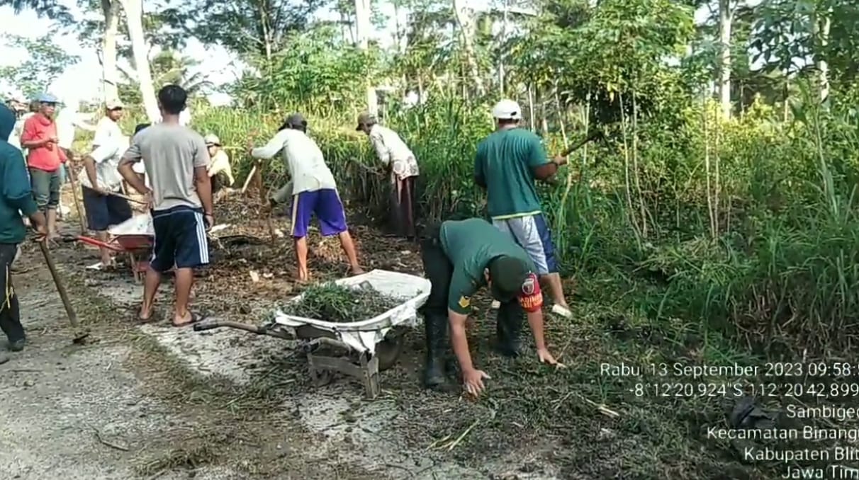 Balance News | Blitar – Tingkatkan Sinergitas, Untuk menjaga kebersihan lingkungan di wilayah binaan agar tetap kelihatan bersih dan rapi, Babinsa Koramil 0808/11 Binangun. Kodim 0808/Blitar Serma Edi Purnomo bersama warga masyarakat, melaksanakan kegiatan kerja bakti pembersihan lingkungan, bertempat di Desa Sambigede Kec. Binangun Kab. Blitar, Rabu (13/9/2023).