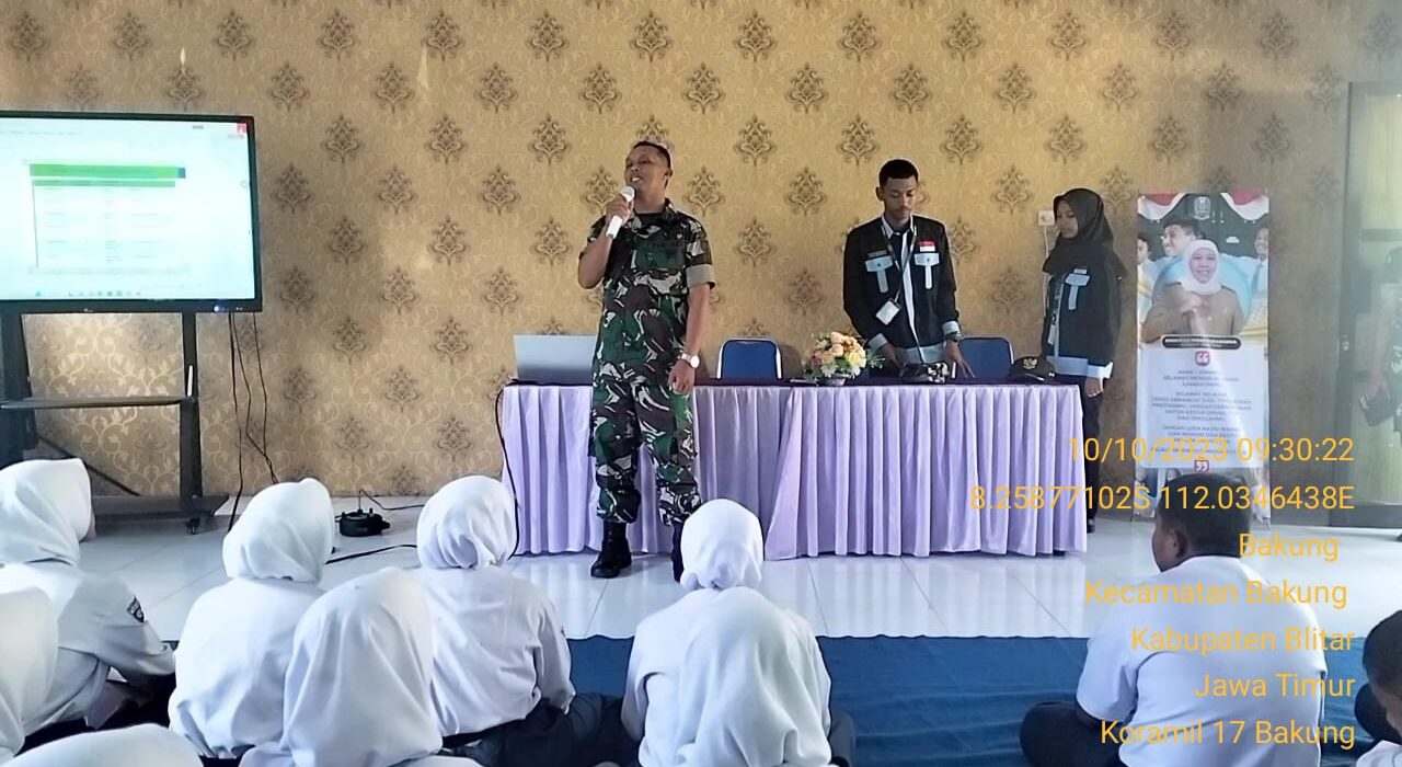 Untuk mewujudkan generasi muda yang berkualitas, anggota Koramil 0808/17 Bakung Kodim 0808/Blitar Pelda Tulus Widodo, melaksanakan kegiatan memberikan wawasan kebangsaan kepada siswa siswi, bertempat di SMKN 01 Bakung Kec. Bakung Kab. Blitar, Selasa (10/10/2023).