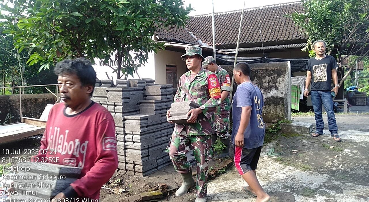 Balance News | Blitar – Untuk mewujudkan rumah layak huni bagi warga kurang mampu yang ada di wilayah binaan, Babinsa Pos Selopuro. Koramil 0808/12 Wlingi Kodim 0808/Blitar Serka Aminoto dan anggota Pos Selopuro bersama warga, melaksanakan kegiatan kerja bakti. Dan gotong royong, untuk membantu merehab rumah tidak layak huni milik Ibu Djaenab, bertempat di Dusun Ngandengan RT. 05 RW. 02 Desa Tegalrejo Kec. Selopuro Kab. Blitar, Senin (10/7/2023).